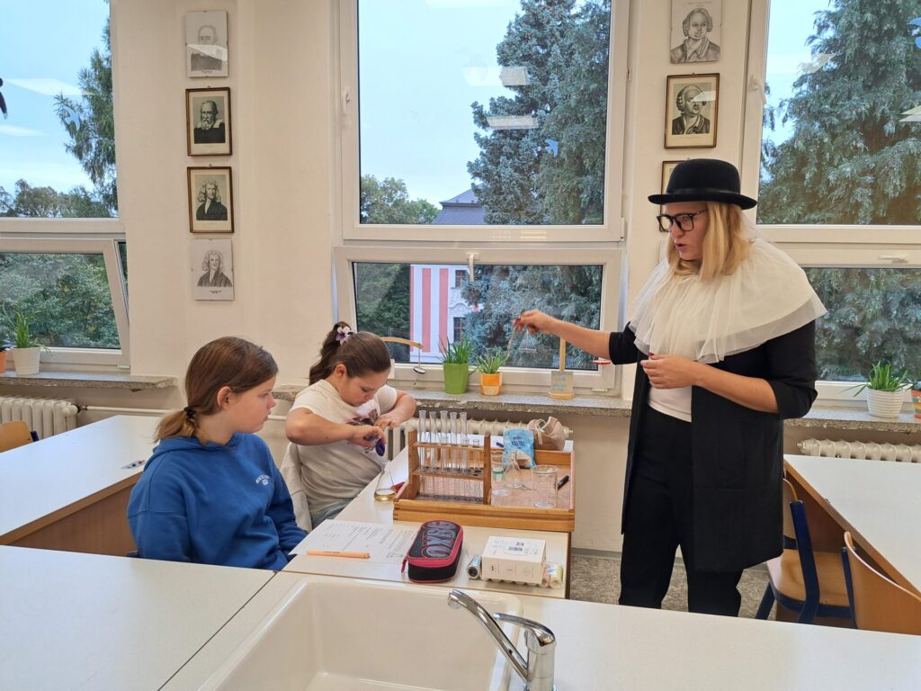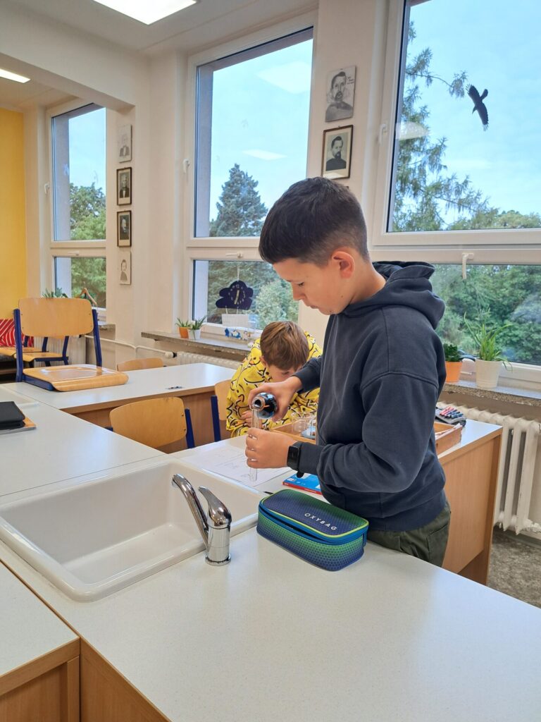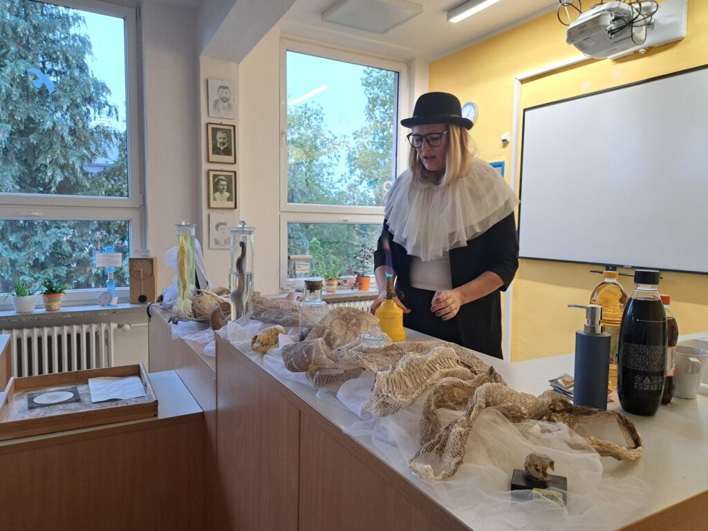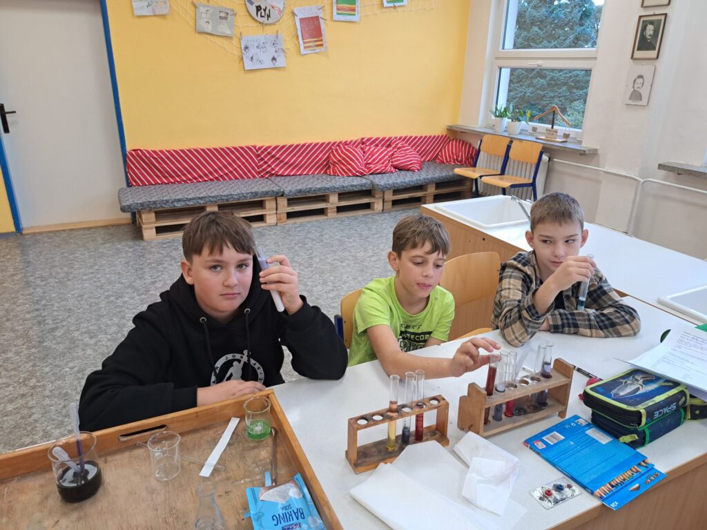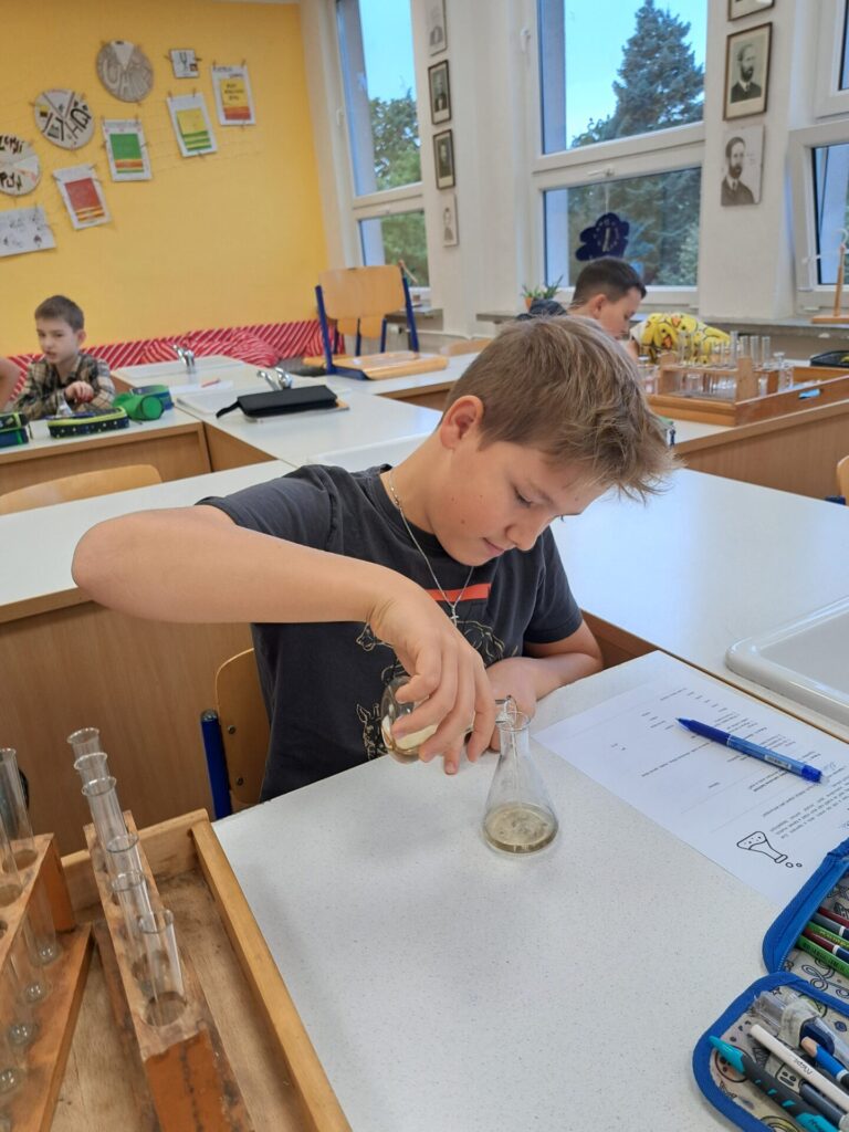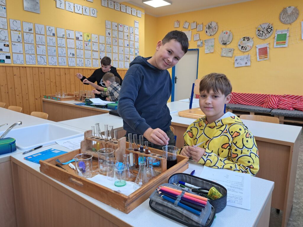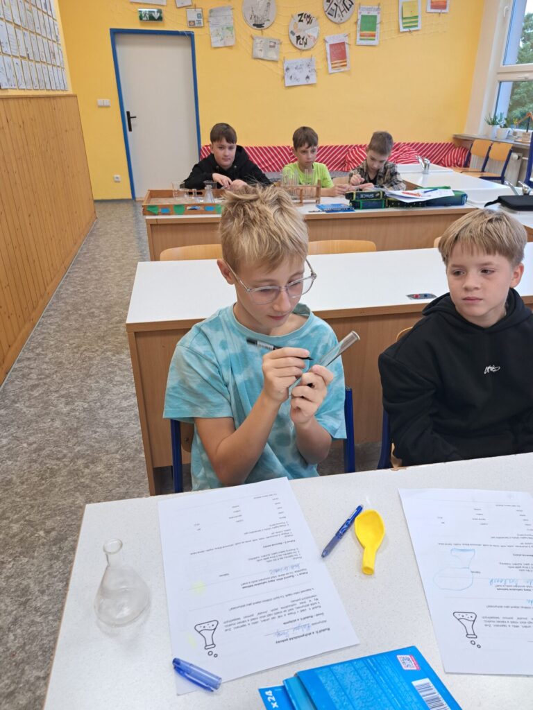V pátek 26. září se naše učebna chemie na chvíli změnila k nepoznání – z moderní laboratoře se stala tajemná alchymistická dílna. V rámci vlastivědy jsme se s dětmi vydali na cestu časem do období Rudolfa II., kdy se v Praze scházeli učenci a alchymisté z celé Evropy, aby hledali kámen mudrců, elixír věčného života či způsob, jak proměnit obyčejný kov ve zlato.