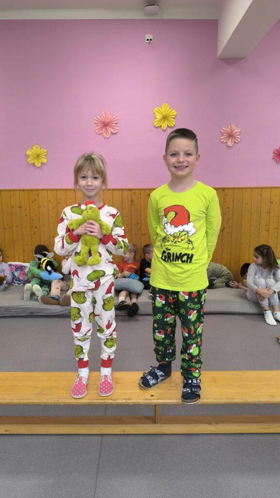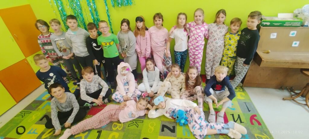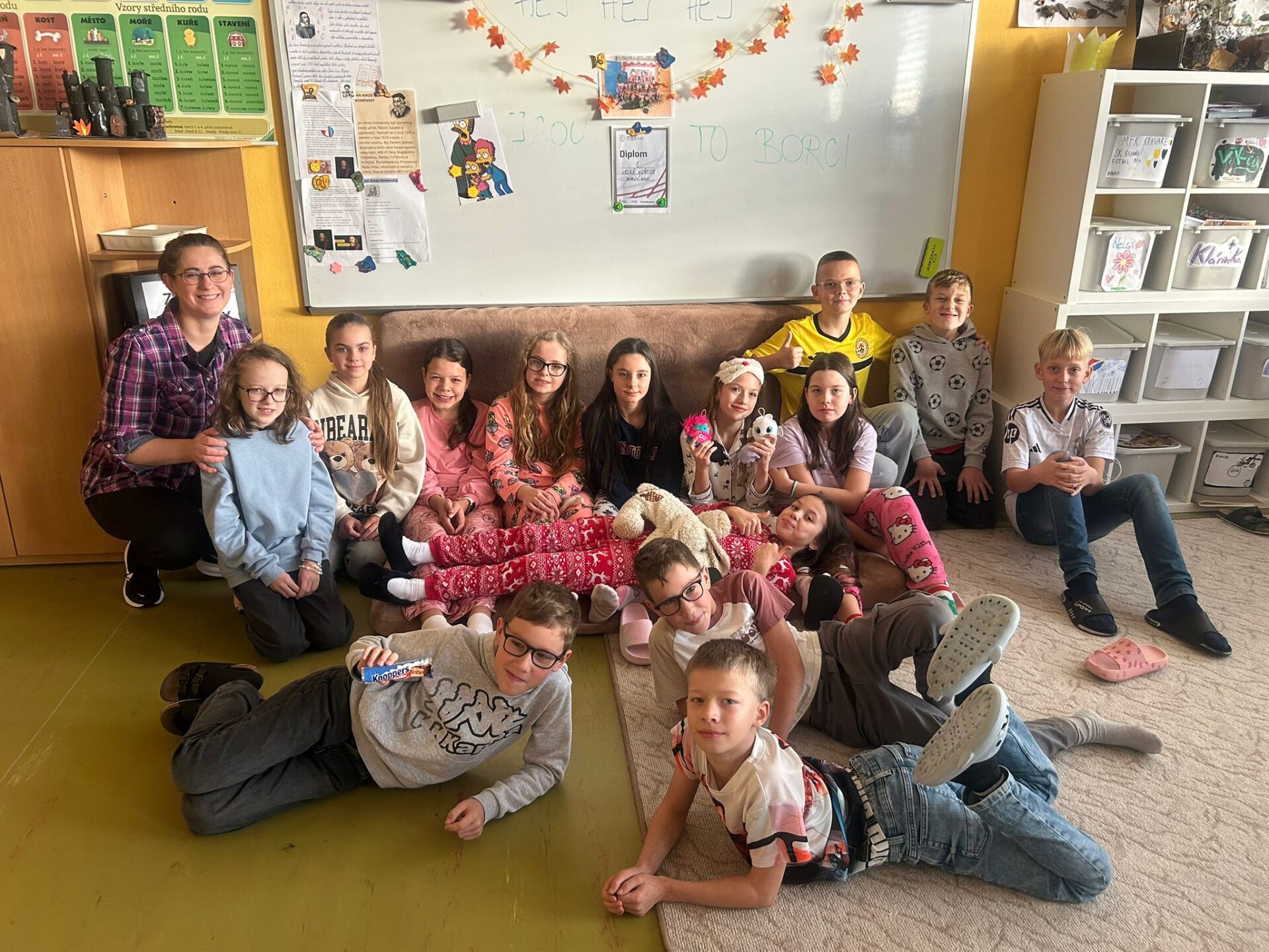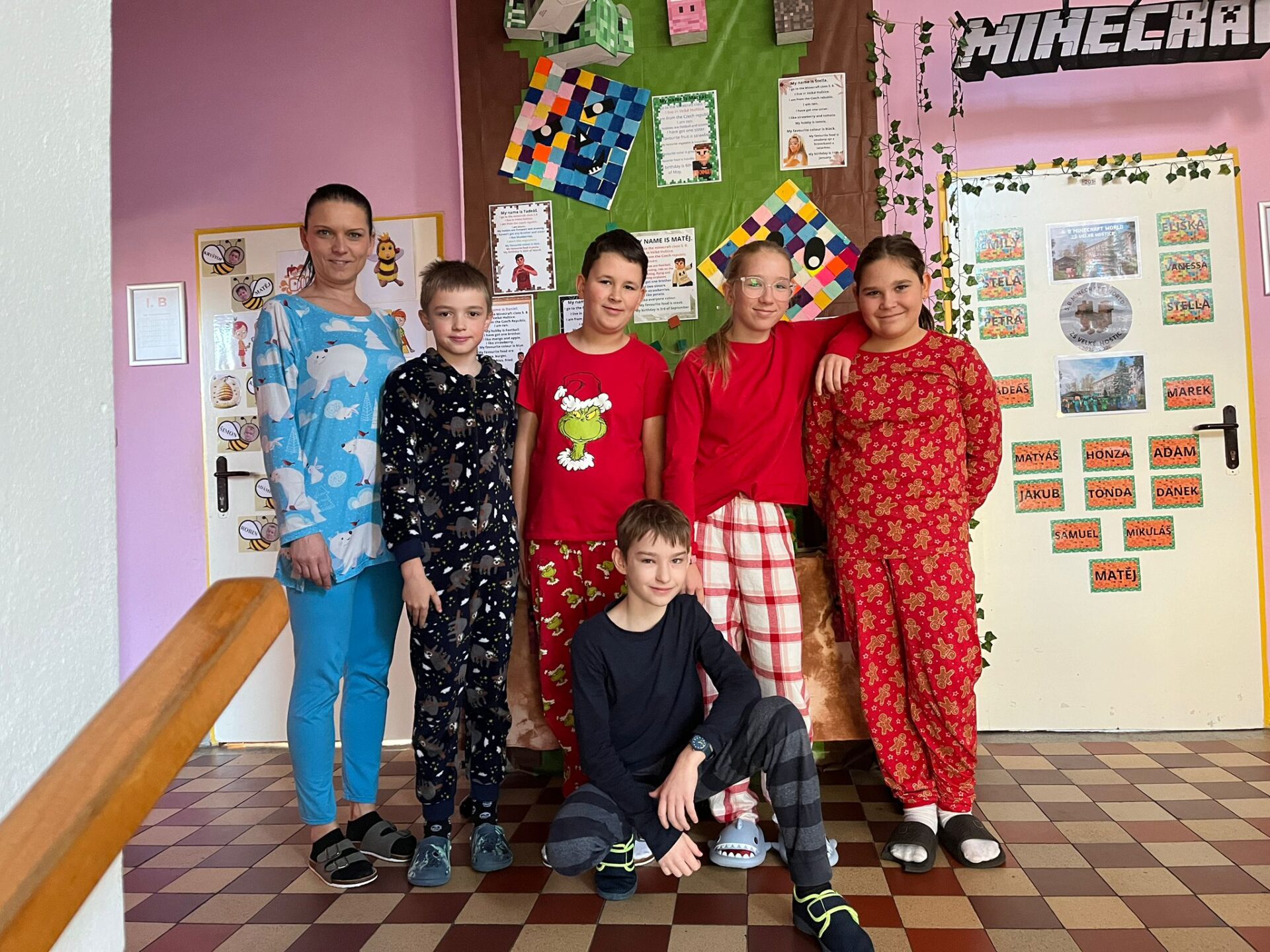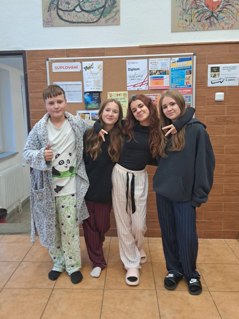 Pátek 14. listopadu byl ve škole výjimečný. Místo běžných školních outfitů se naše třídy zaplnily hebkými pyžamky, veselými vzory, huňatými ponožkami i župany.