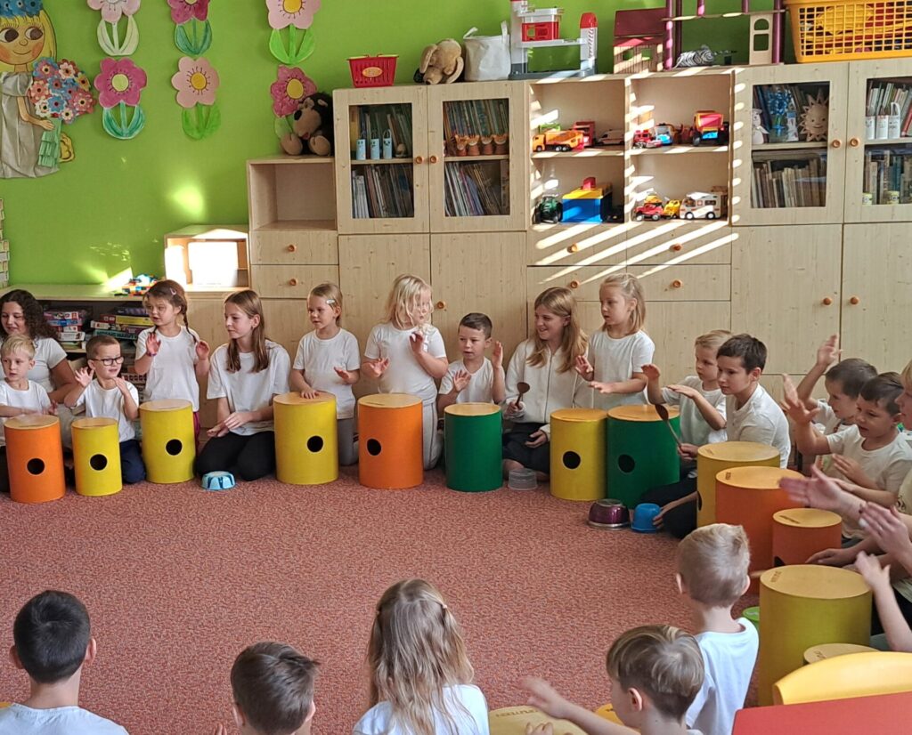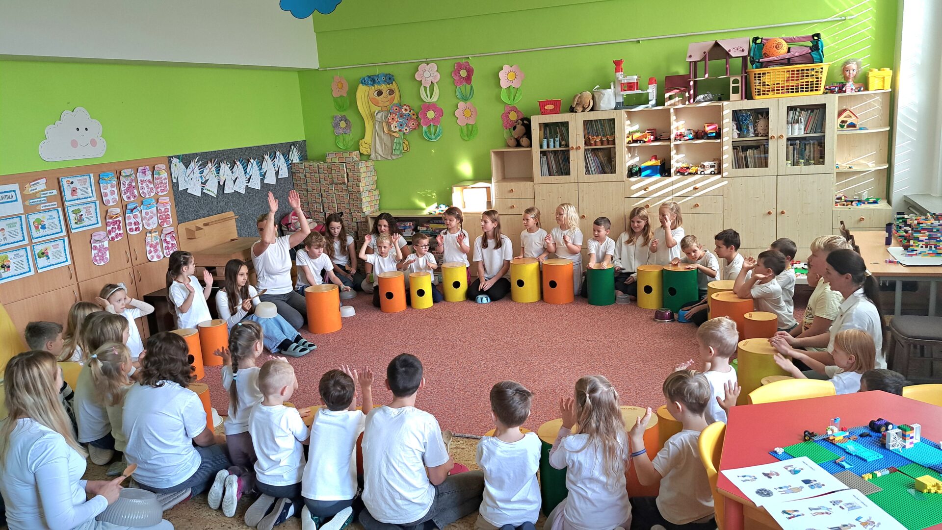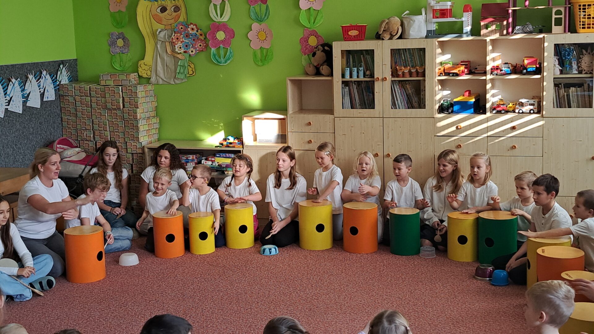 Velkou radost nám udělala i návštěva předškoláků, kteří přišli starším žákům pomoci a vytvořili neuvěřitelně přátelskou atmosféru. Tentokrát však neplatilo, že starší učí mladší – bylo to naopak. Nejmenší určovali tempo, rytmus i způsob bubnování a třída 6. A bubnovala podle nich. Předškoláci převzali roli lídrů s obrovskou chutí, jistotou a radostí.