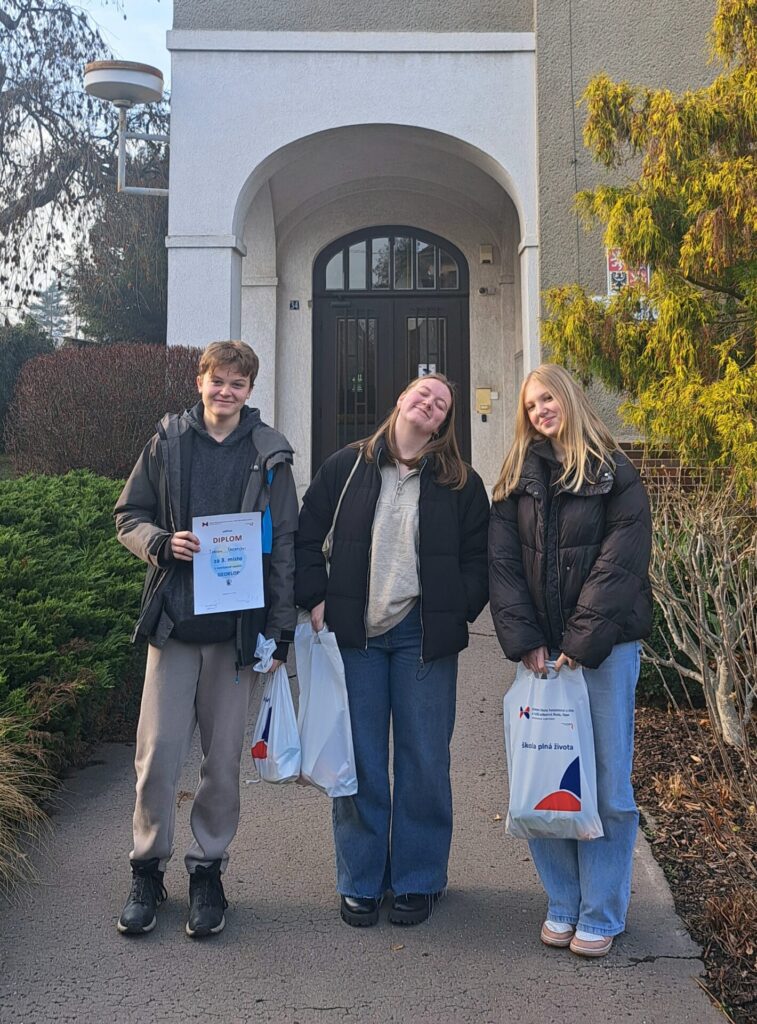 Do soutěže se zapojily týmy z různých škol Opavska – a mezi nimi i naši deváťáci Amálka Vitásková, Marťa Gilíková a Tobi Šrom.
