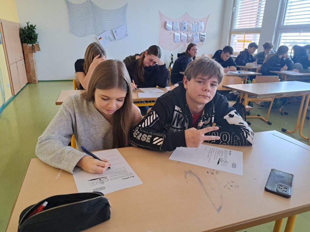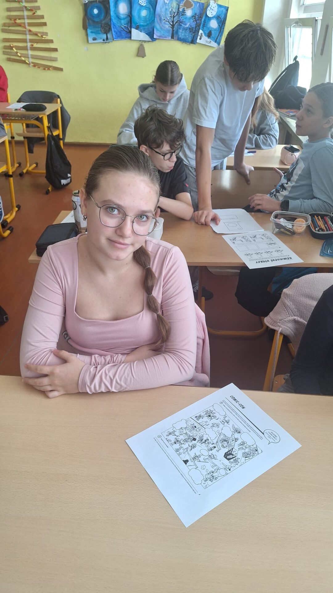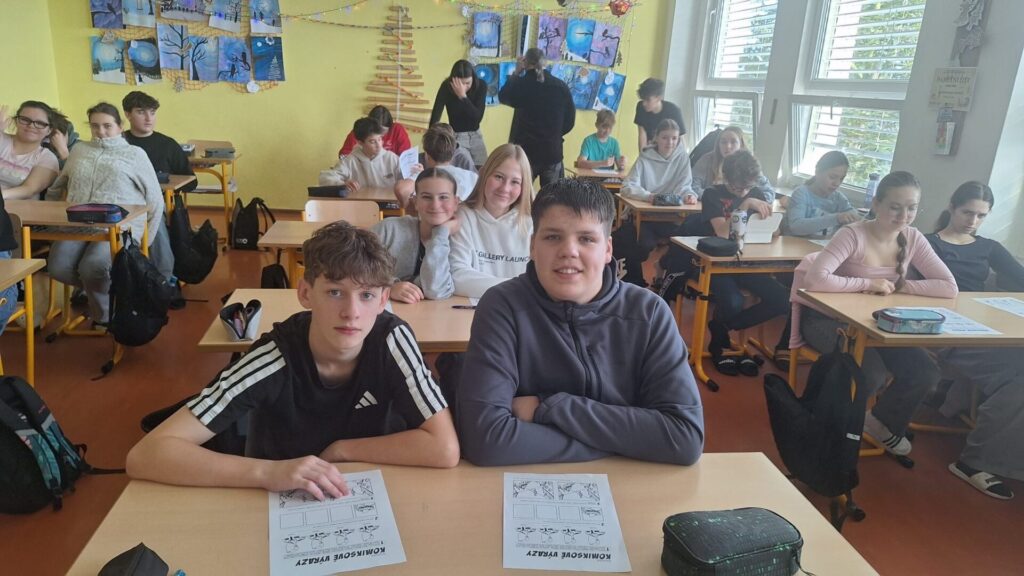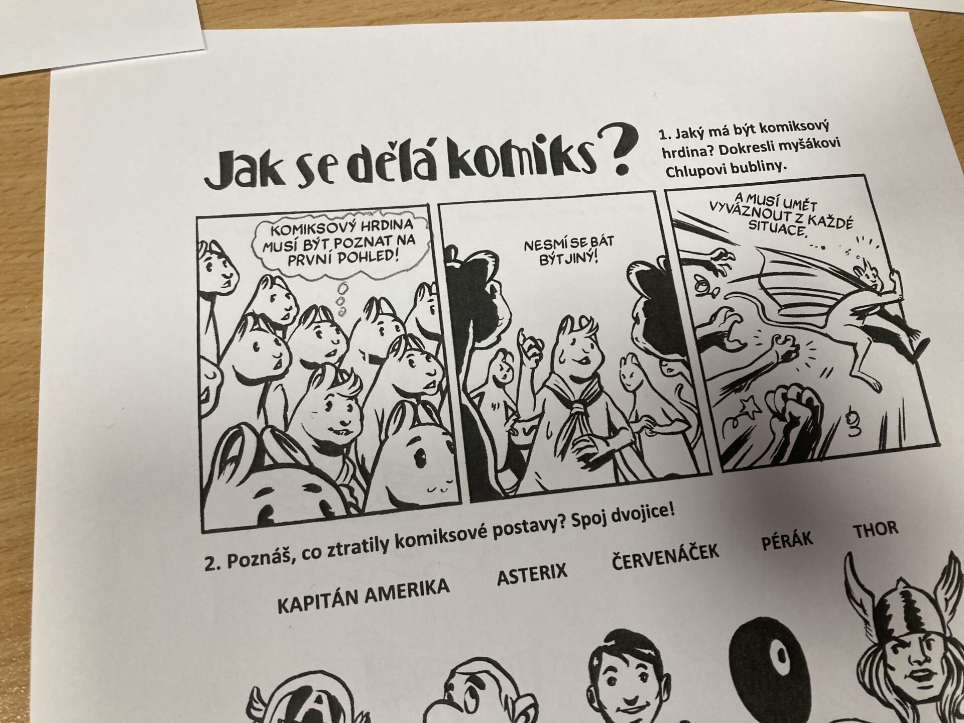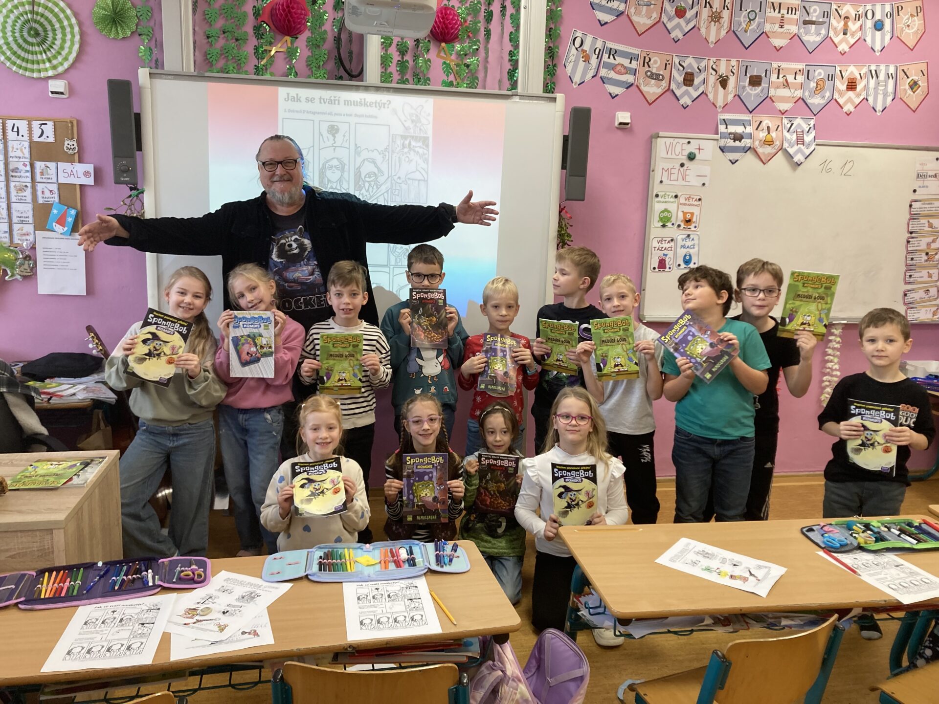 Žáky 2., 8. a 9. tříd vtáhl do tajů tvorby komiksů. Vysvětlil, že bubliny v komiksu mají jiný význam. Žáci zjistili, že na tvorbě komiksu se podílí celý tým profesionálů: scénárista, kreslíř, kolorista, inker, letterista. Všechny tyto role si žáci během ukázky vyzkoušeli a žasli nad tím, kolik práce je s každým novým číslem jejich oblíbeného komiksu.