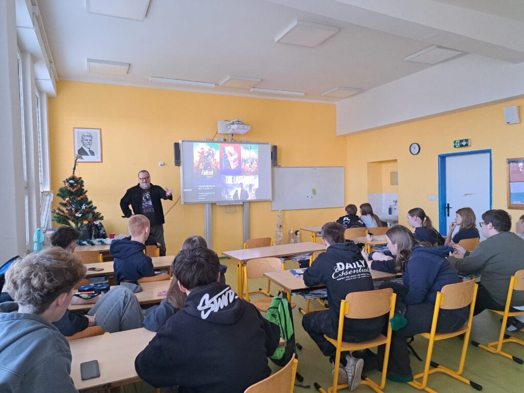 Ve středu 17. 12. 2025 nás ve škole navštívil pan Jiří Procházka, scénárista komiksů jako je např. Čtyřlístek a také autor knih pro děti i dospělé.