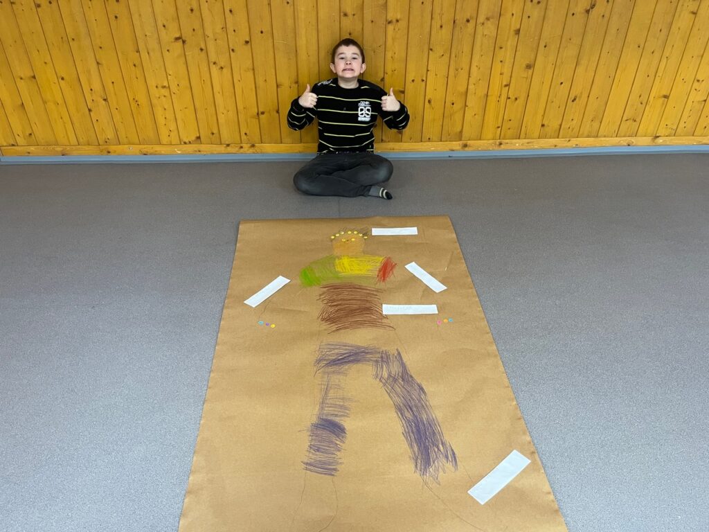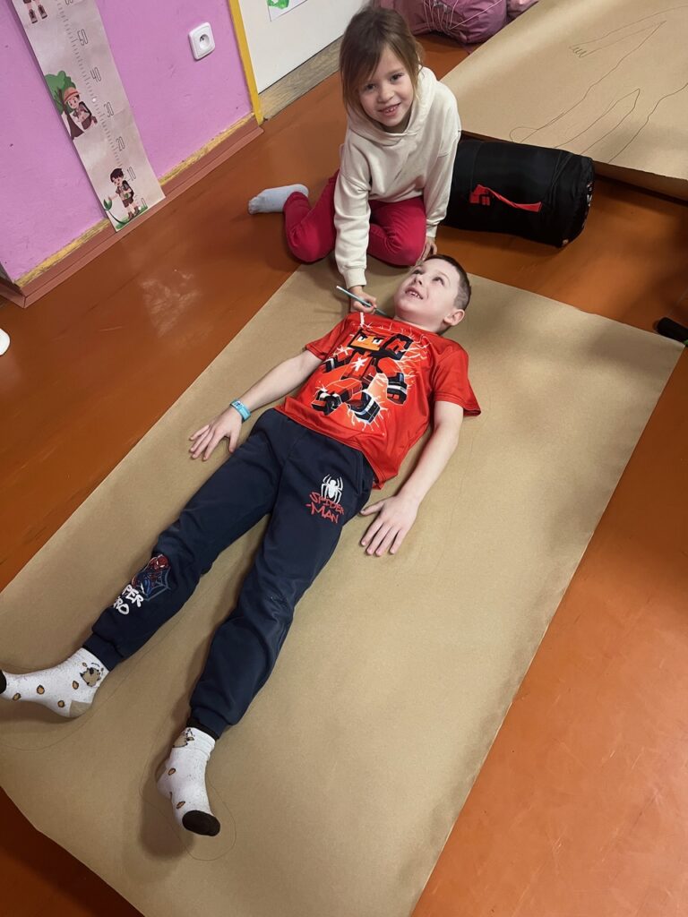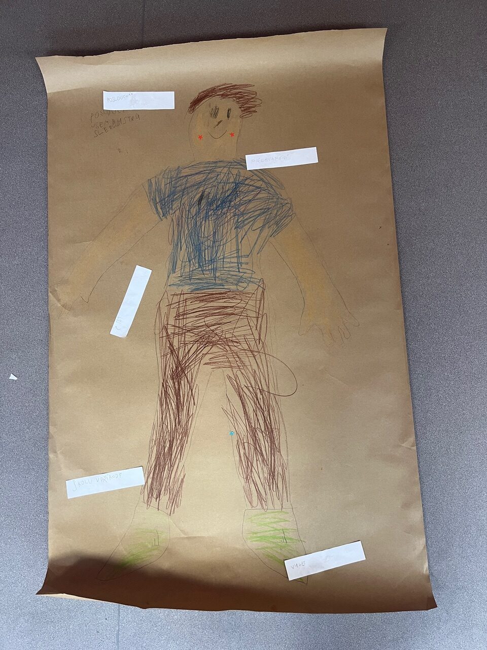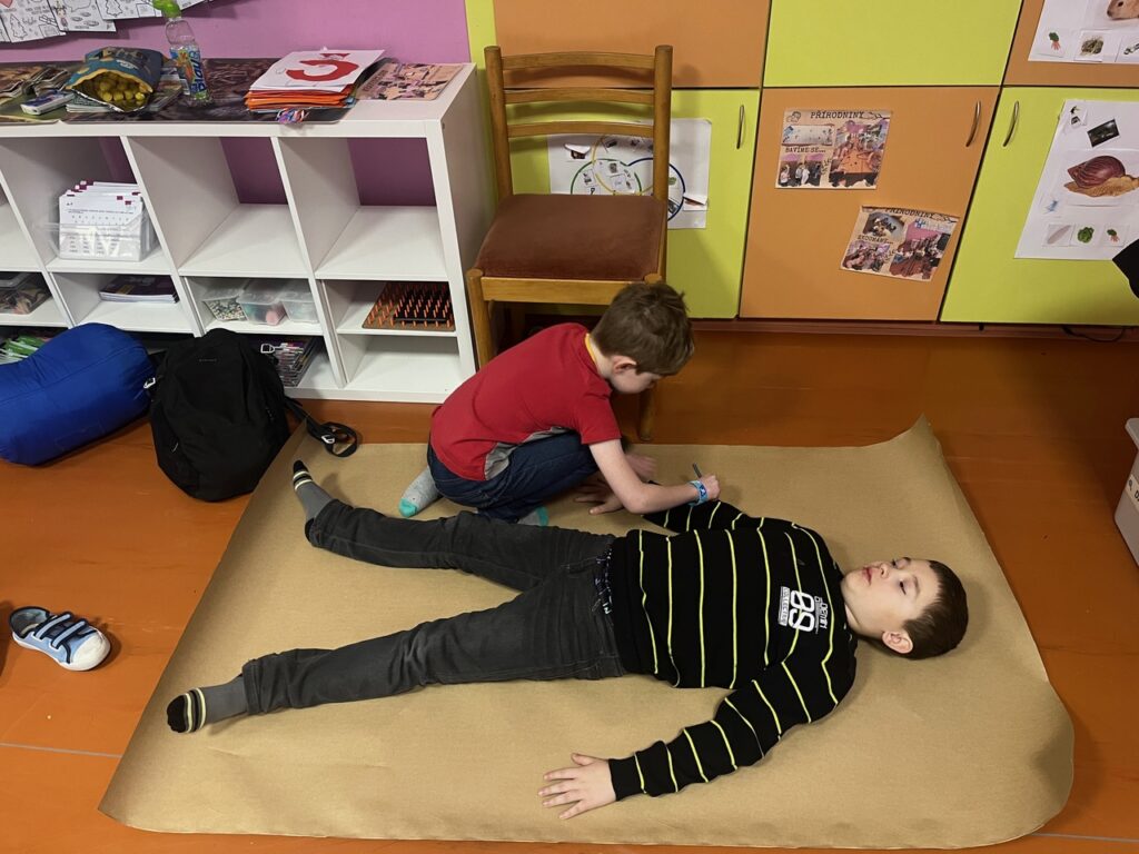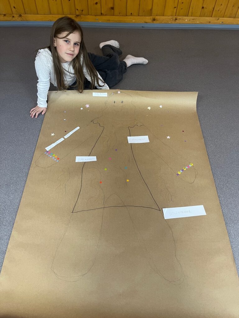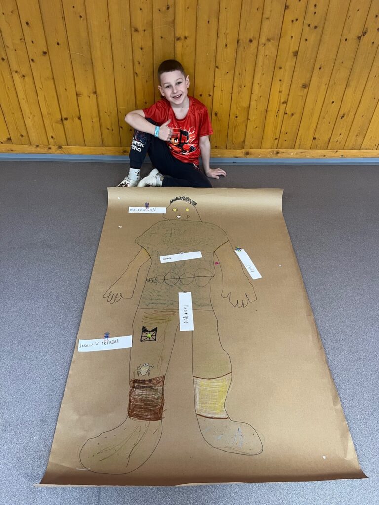 Každé dítě si vytvořilo postavu samo sebe v životní velikosti. Děti se navzájem obkreslily na velký papír a postavu postupně „plnily“ svým příběhem. K hlavě psaly, jak se učí, k srdci, jak se ve škole cítí, k ruce, co už zvládají jako školáci, a k nohám, kam by chtěly jít dál. Součástí byla i práce s portfoliem. Děti psaly vlastními slovy, s oporou jednoduchých otázek.