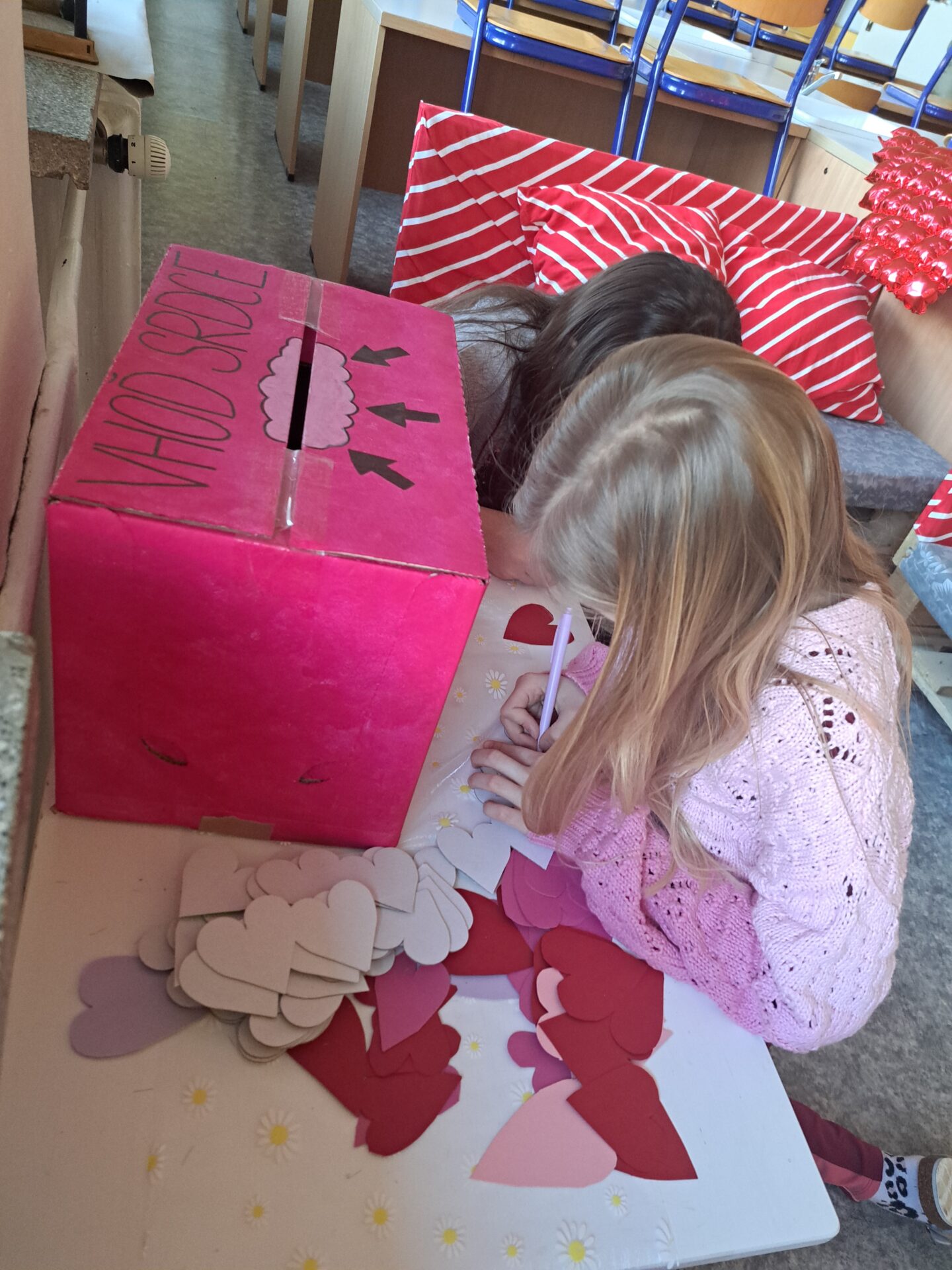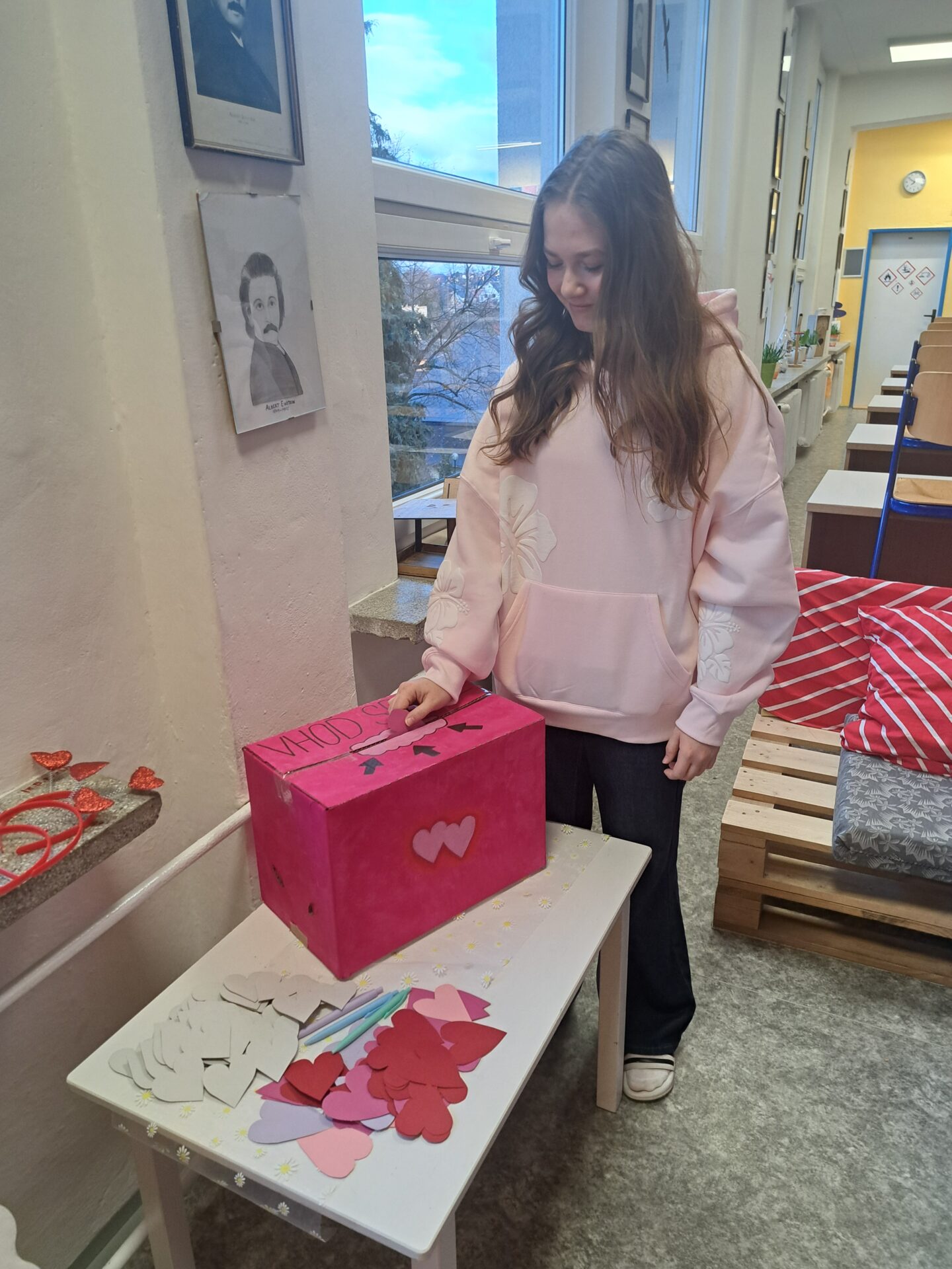 Každý měl možnost napsat hezký a milý vzkaz svému kamarádovi, spolužačce nebo celé třídě. Valentýnky pak žáci vhazovali do „krabice na srdíčka“, která se během dne zaplnila barevnými lístečky plnými poděkování a povzbuzení. Členové parlamentu se následně ujali role školní pošty, všechny vzkazy roztřídili a roznesli do tříd. Mnohé z nich vykouzlily překvapení i upřímné úsměvy.
