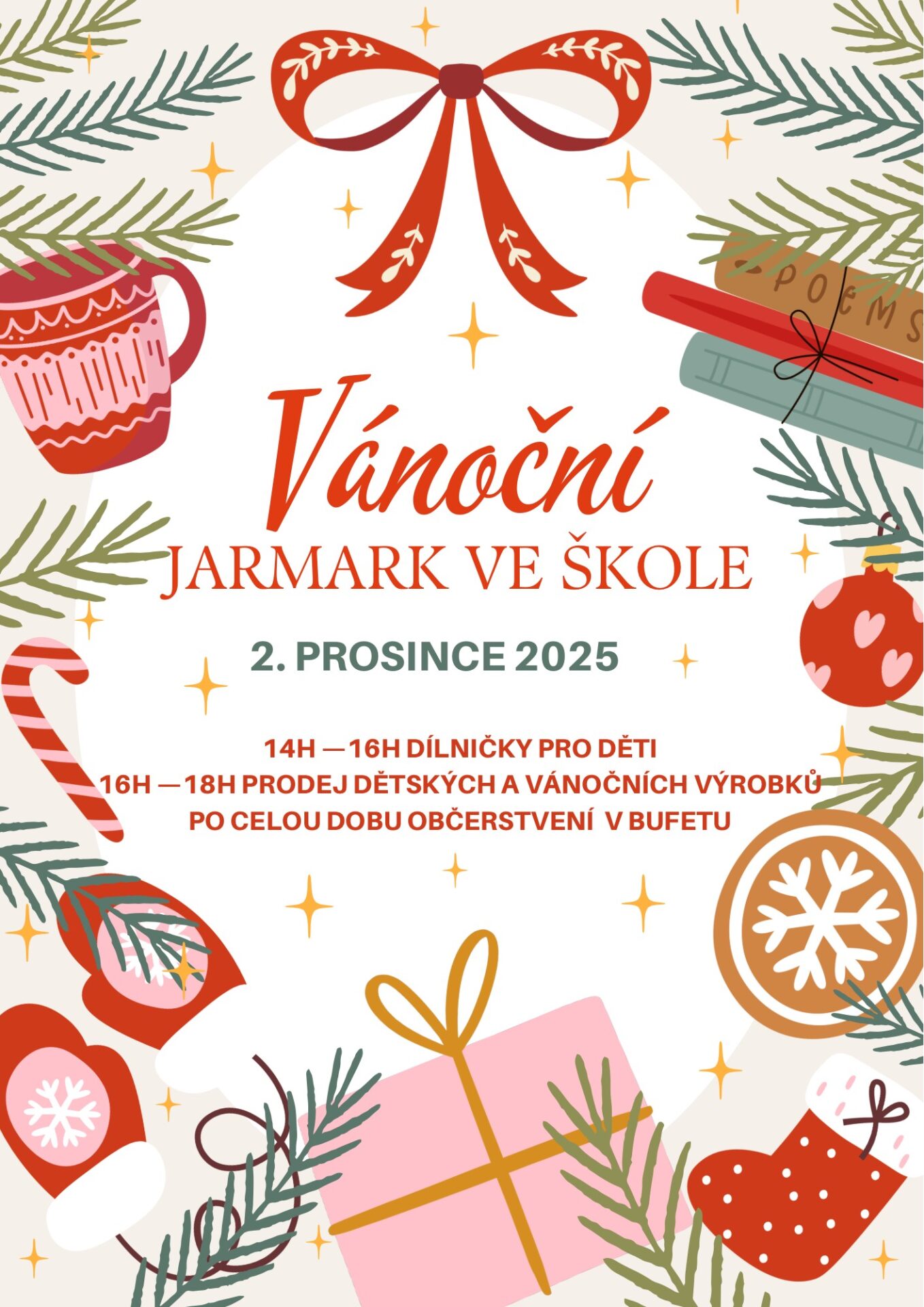 Zveme Vás na úterý 2. prosince do školy na vánoční jarmark. Můžete si vyrobit vánoční ozdobu, koupit nějaký dáreček nebo se občerstvit v naší vánoční kavárně. Přijďte se svátečně naladit.